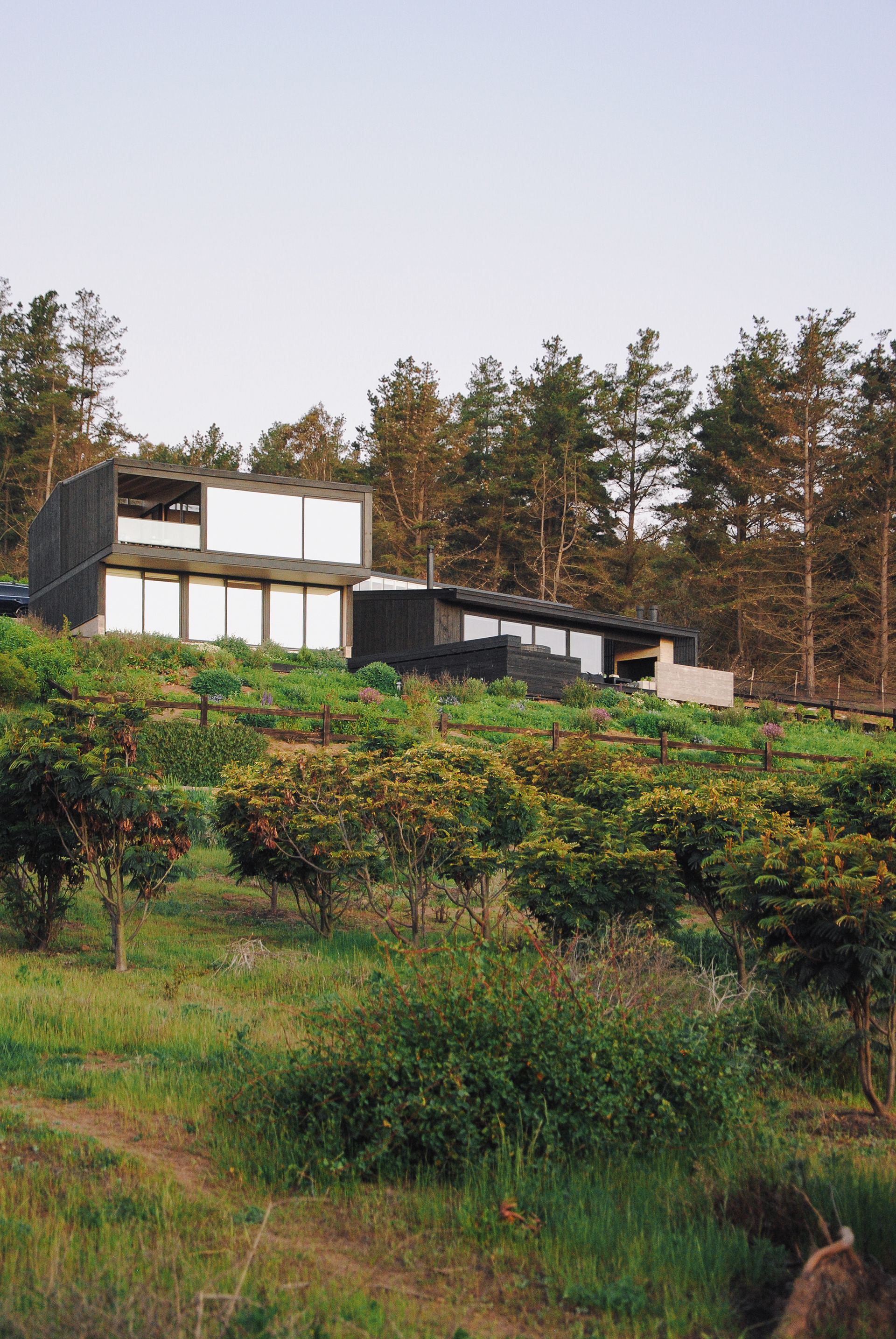 Ambos volúmenes, conectados en el punto del acceso, que actúa como articulador del conjunto, responden a distintas escalas de privacidad. El primero, de un nivel, alberga los espacios públicos y de servicio, organizados entorno a un espacio común fragmentado por un desnivel que separa la cocina del estar - comedor. Sobre esta articulación, una lucarna lineal introduce luz natural. El segundo volumen, de dos niveles, se ubica en la zona más resguardada del terreno y contiene las habitaciones, garantizando privacidad sin perder relación con el entorno.